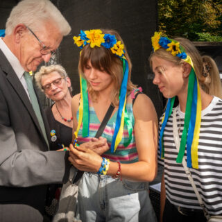 Zum Nationalfeiertag der Ukraine am 24.08.2022 besuchte Winfried Kretschmann die Ukrainehilfe in Ulm und kam mit Geflüchteten und Einheimischen ins Gespräch.