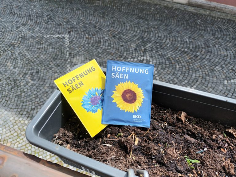 EKD надала насіння соняшника та волошок. На знак надії ми хочемо посадити якомога більше квітів, які потім розквітнуть у кольорах України – жовтому та блакитному.