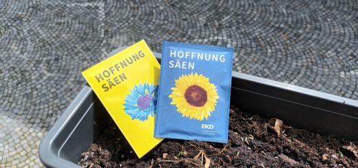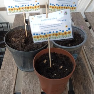 Von der EKD wurden Samen für Sonnenblumen und Kornblumen zur Verfügung gestellt. Als Zeichen der Hoffnung sollen so viele Blumen wie möglich gepflanzt werden, die dann in den Farben der Ukraine, Gelb und Blau erblühen werden.
